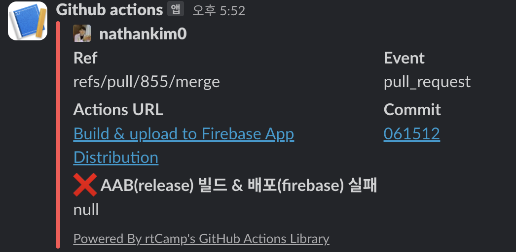 성공 시 Slack 알림: 배포가 성공적으로 완료되면, rtCamp/action-slack-notify@v2를 사용해 Slack으로 성공 알림을 보냅니다. 여기서는 Firebase Console 링크, PR 제목, 메시지 등을 포함한 메시지를 설정합니다.
