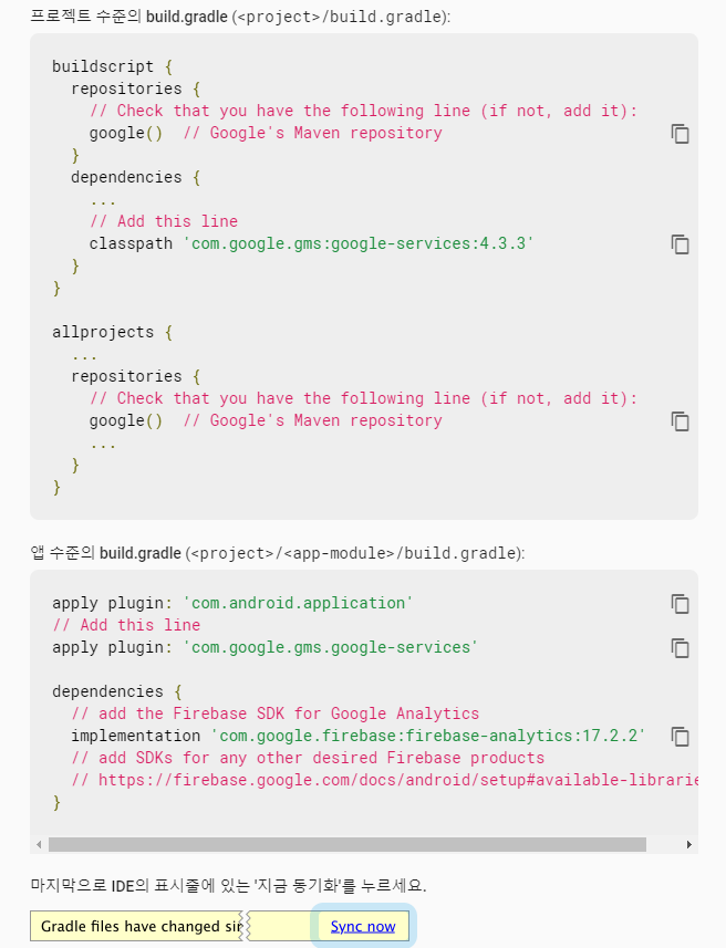 google-services.json 파일을 다운로드 하고, 안드로이드 스튜디오에서 프로젝트 범위로 전환 후 앱 단위 폴더에 붙여넣고 다음 클릭